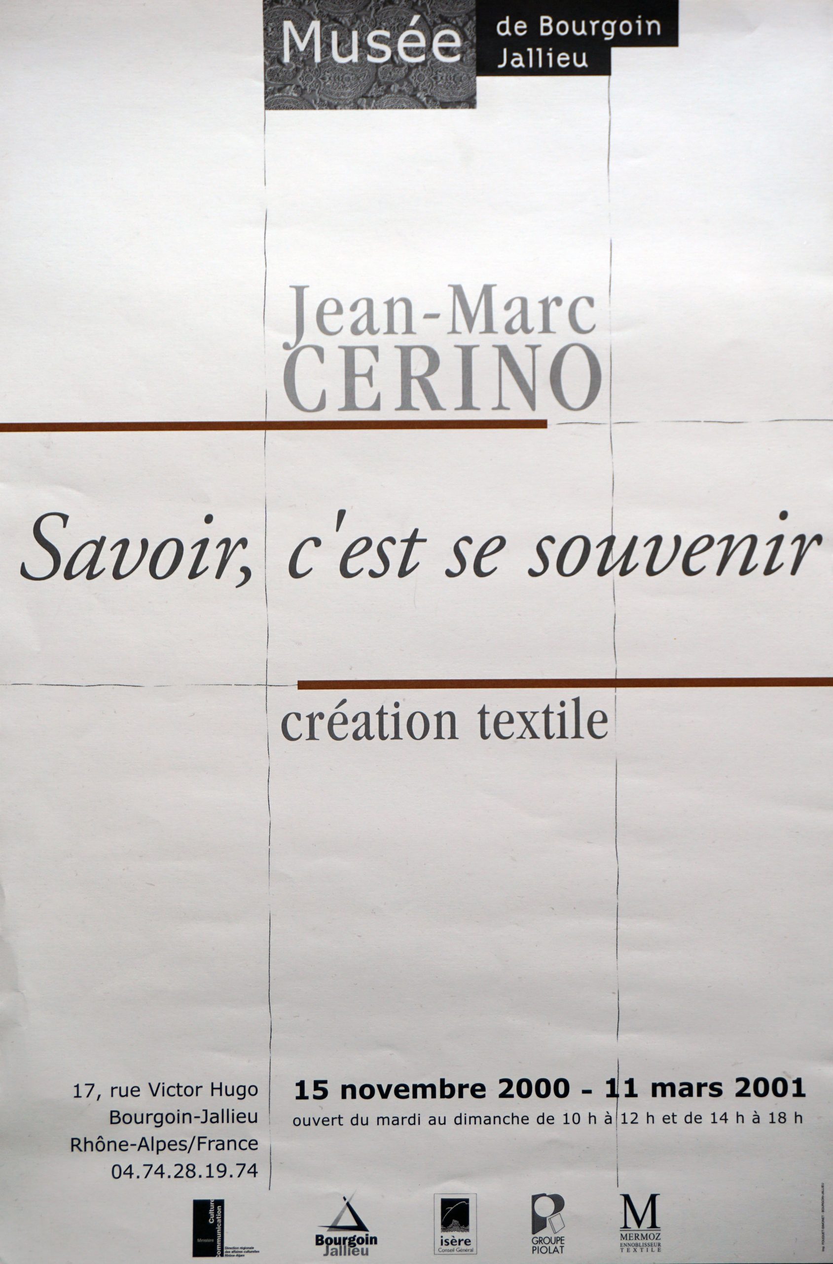 Les séries figuratives de Cérino utilisent habituellement une technique d’encaustiquage particulière et surtout la seule couleur blanche et ses variations ! Dans cette exposition originale, le travail des ouvriers du textile est revalorisé, en les représentant et en utilisant la technique de photogravure textile.